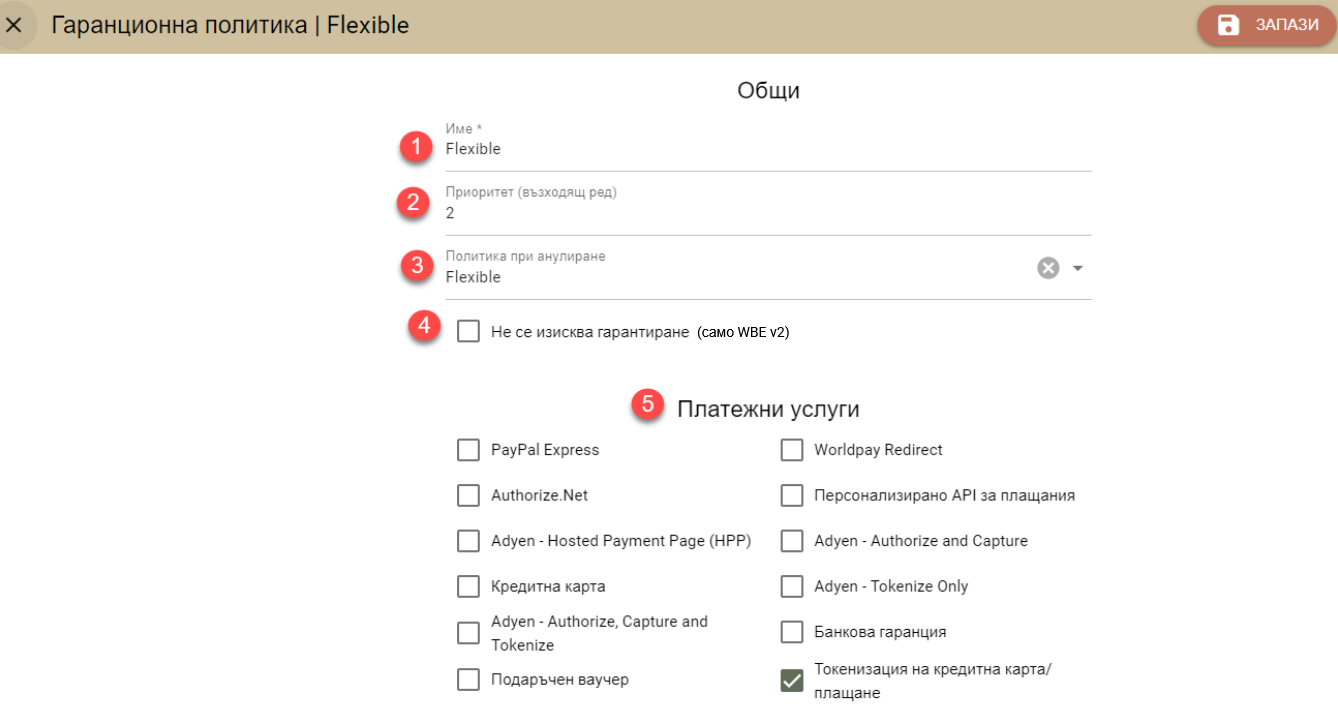 - Платежни услуги (5) - Изберете кои платежни услуги да приложите към тази политика. Платежните услуги се използват в WBE и Портал на госта. Те дефинират как може да бъде финализирана резервация: с онлайн плащане, чрез предоставяне на данни за кредитна карта или чрез офлайн банково плащане: