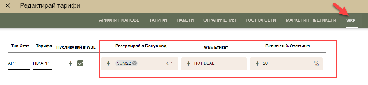 Заедно с бонус кода можете да приложите и "Етикет" към тарифата. Този етикет се вижда до името на тарифата. Можете да прилагате етикети към всички тарифи, които са публикувани в WBE, а не само към тези, които са скрити зад бонус код.