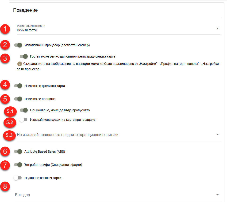 - Регистрация на гости (1) от секцията "Поведение" - определя колко регистрационни карти трябва да бъдат попълнени: Само основен гост, Само възрастни или Всички гости;
