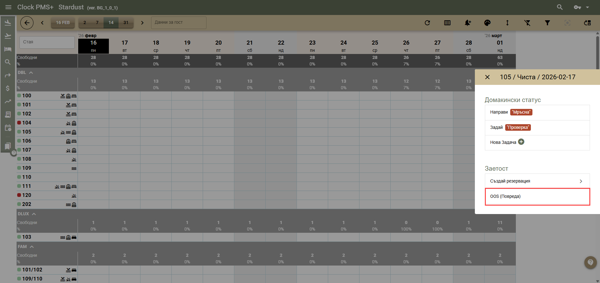 - В реда на стаята кликнете върху клетка, която е част от OOS статуса (Календар на стаите) или върху самата стая (План на стаите), за да отворите менюто;