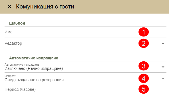 Забележка: Ако желаете имейлите преди заминаване да бъдат изпратени в 17:00 часа на деня преди заминаване, трябва да въведете полето "Времеви период (часове)" : 19, т.е. 19 часа преди 12:00 часа на обяд на датата на заминаване. Имейлите се изпращат само за резервации със статус "Настанени".