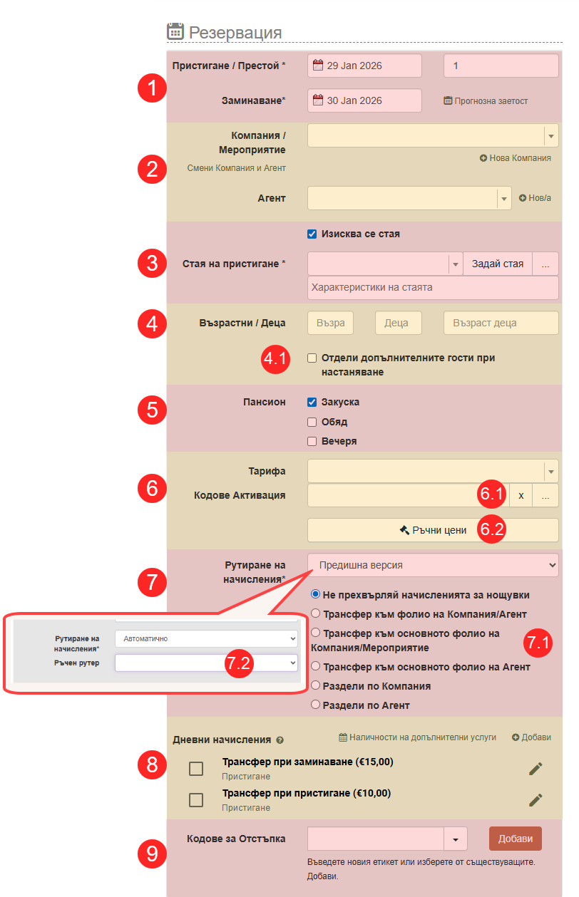 - Рутиране на начисления (7) - позволява да насочите начисленията по резервацията към Компания, Агент или Мероприятие. Можете да изберете дали да използвате: