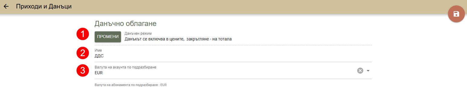 Потребителят трябва да има активирани права „Промени датата на приходите“ и „Настройки: Данъци“.