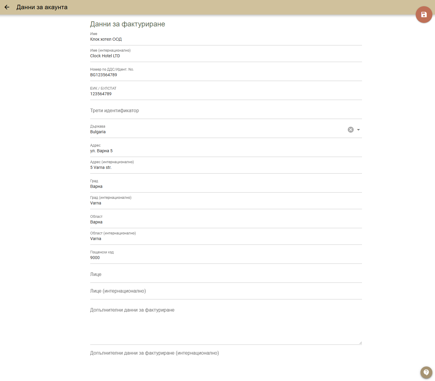 Забележка: Можете да съхранявате и използвате данните на компанията си на два езика - местен и интернационален. Местните гости ще виждат имената и адресите на компани на местния език, а чуждестранните гости ще ги виждат на интернационалния език (напр. английски). Например, ако страната на фактуриране е България, интернационалните данни ще се използват при отпечатване на фолио на друг език, различен от български.