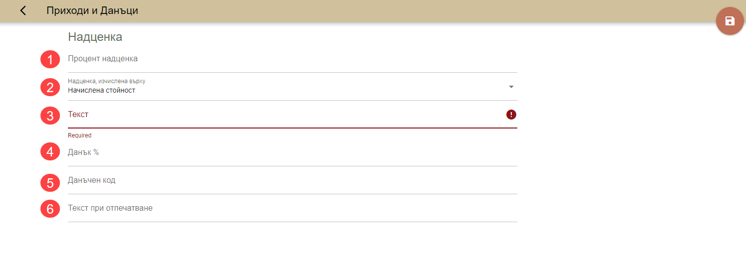 - Данък % (4) - данъчният процент, с който да се обложи надценката;