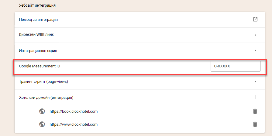 - В раздела "Уебсайт интеграция" - попълнете полето "Google Measurement ID" с идентификацията на хотела и запишете екрана.