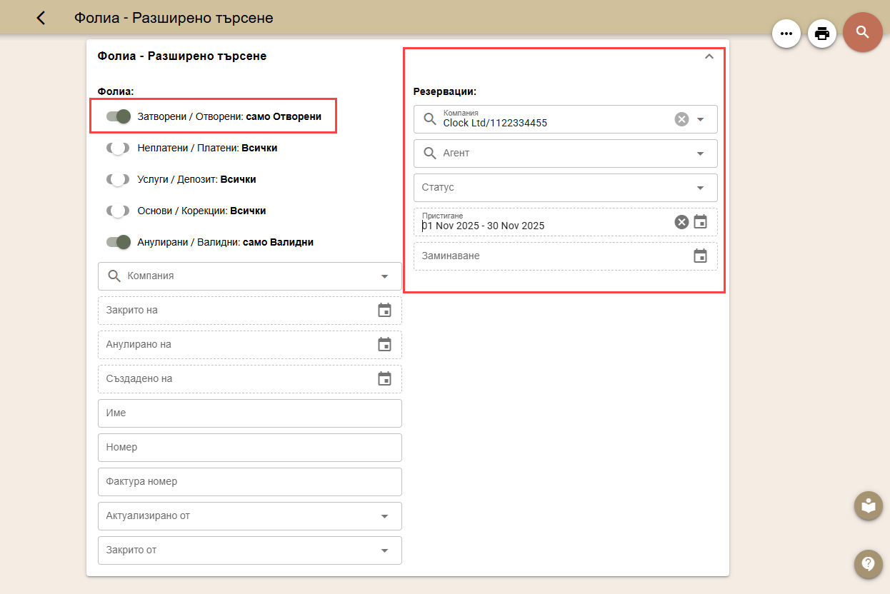 - Въведете критерии за търсене на резервационните фолиа – изберете само Отворени фолиа, посочете Компанията, избрана е резервациите, както и период на пристигане или заминаване;