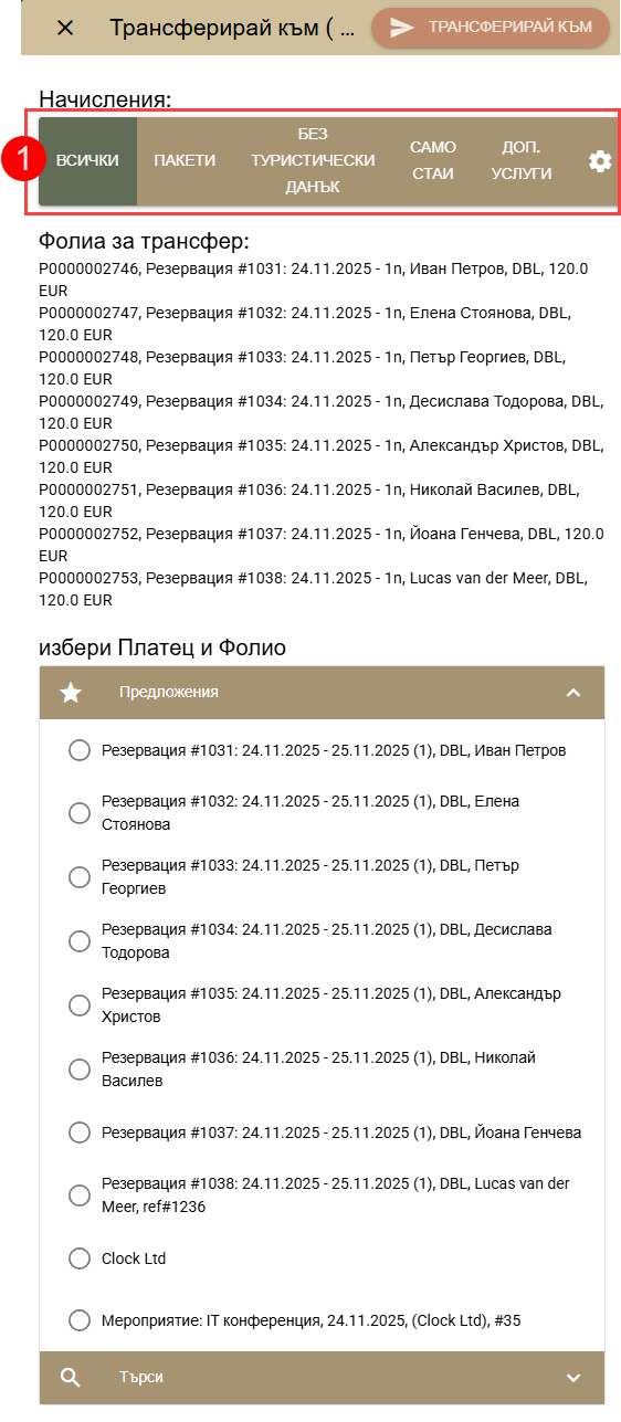 - Използвайте филтрите (1), за да посочите кои начисления да бъдат трансферирани.