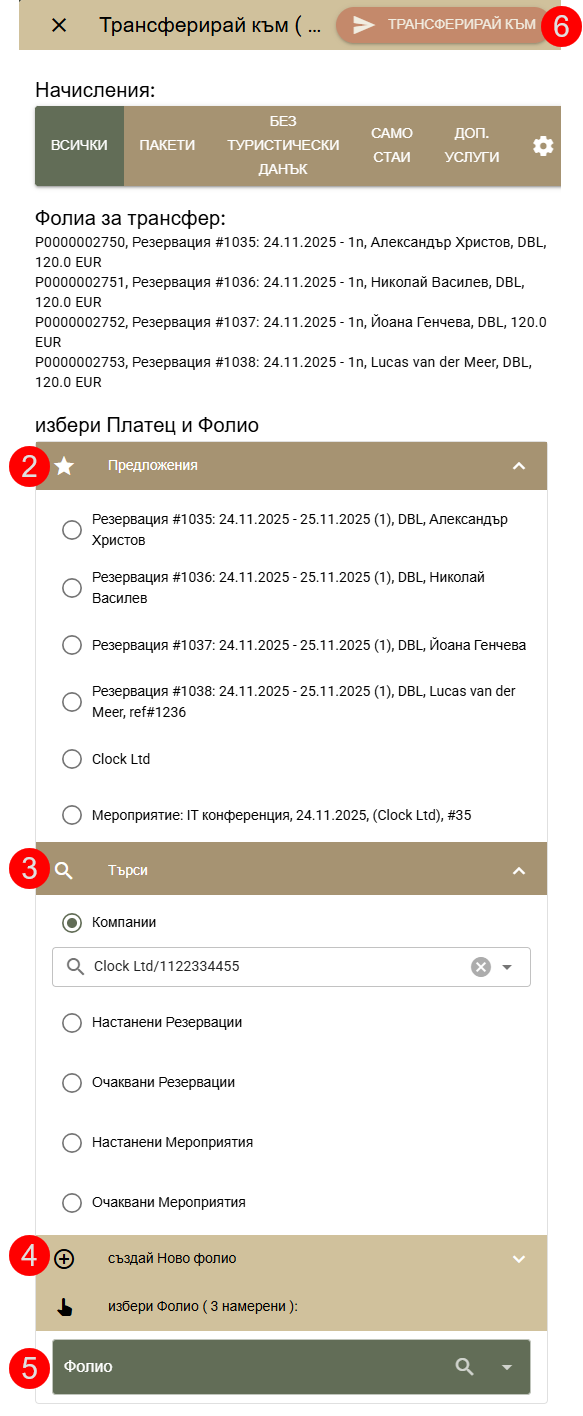 - Ако все още нямате фолио – създайте ново (4), към което да бъдат прехвърлени начисленията от избраните резервационни фолиа.