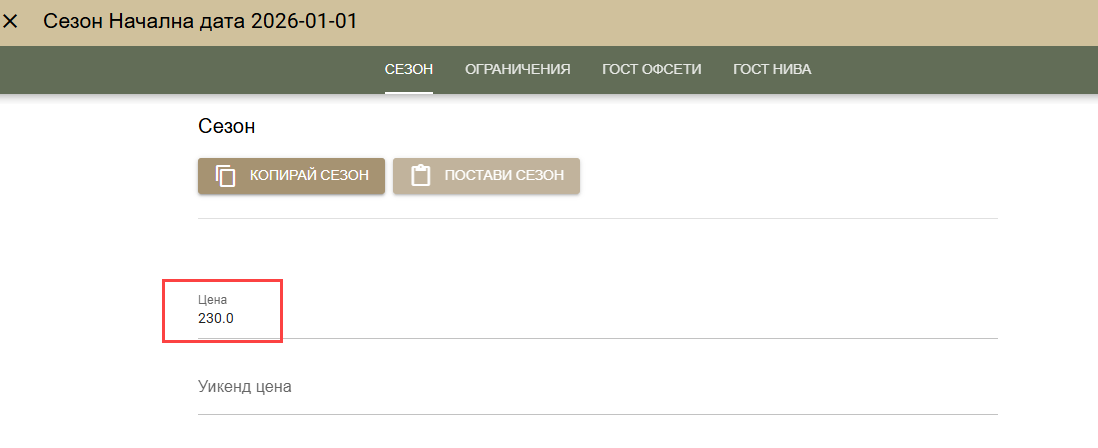- В сезона въвеждаме 230 като базова цена.