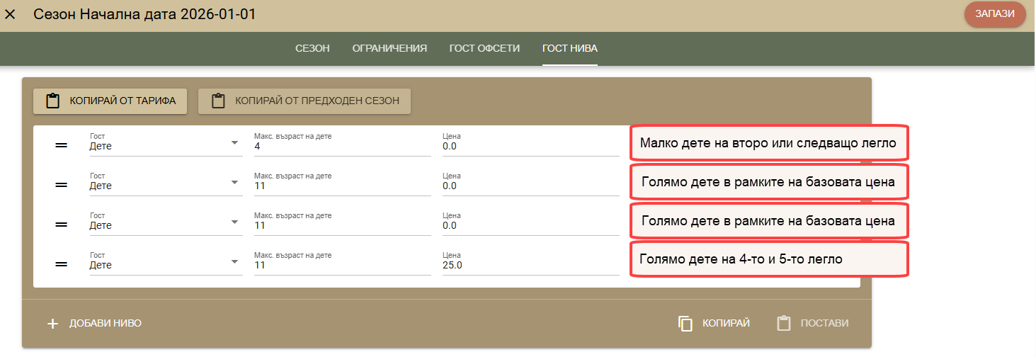 Продължаваме с нивата, които описват доплащането за 4-ти и 5-ти гост: