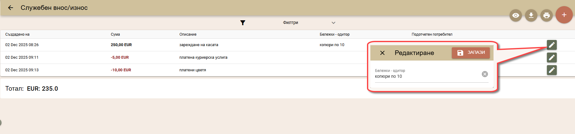 - Служебен внос/износ - Одит - позволява регистриране на операции , както на собствено име, така и на името на някой друг. Тоест, ако сте касиер и предавате парични средства на друго лице, може да укажете другото лице като получило средствата. Така в системата ще остане ясна информация и за двамата потребители.