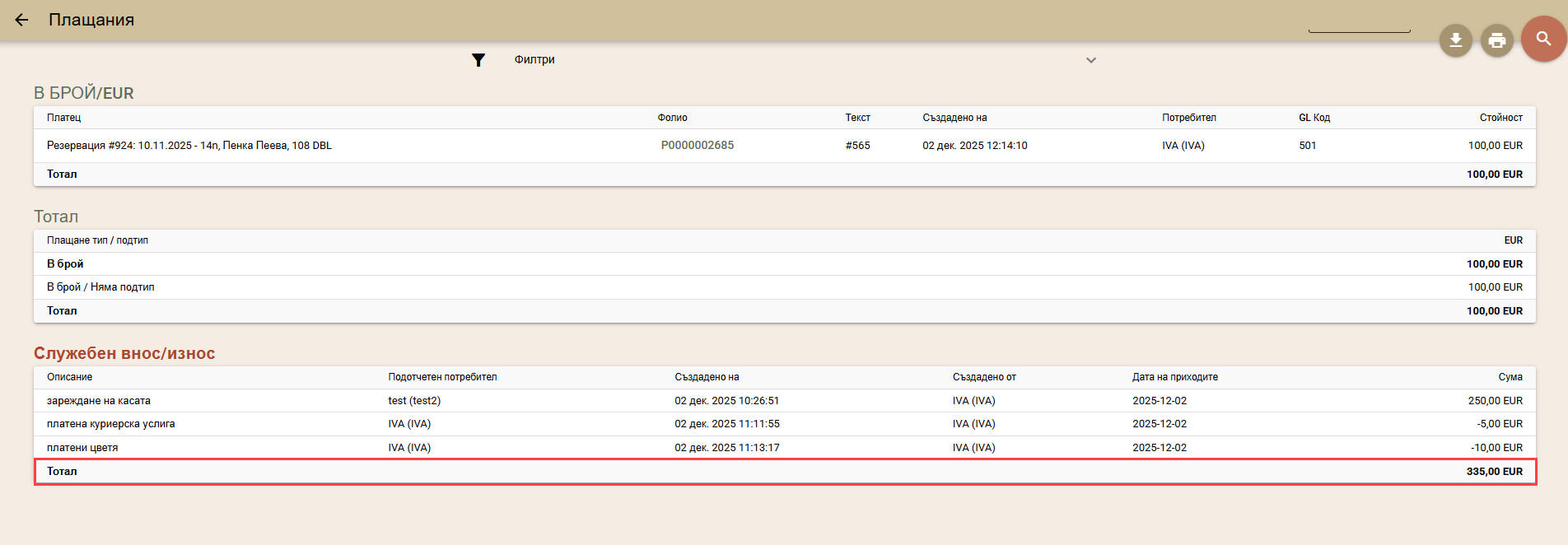 Функцията „Служебен внос/износ“ ви дава възможност да следите служебните касови потоци и общата касова наличност. Плащанията, отразени във фолиата, проследяват само разплащанията с клиенти. Тази функционалност е насочена към регистриране на движения в касата извън хотелските сметки – например зареждане на касата с оборотни средства, изтегляне на суми за вътрешни разходи и др.