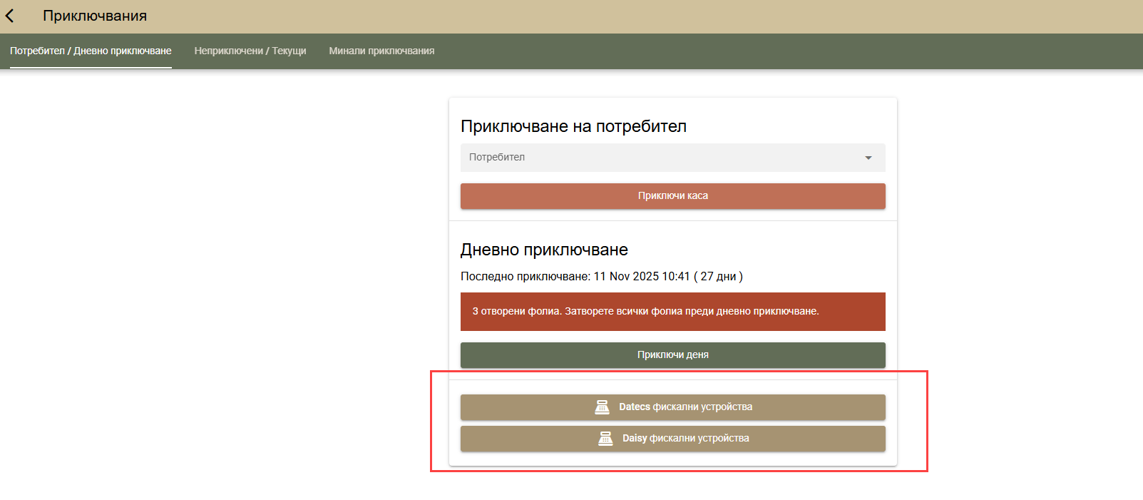- От менюто за навигация изберете Други функционалности → Приключване на каса;