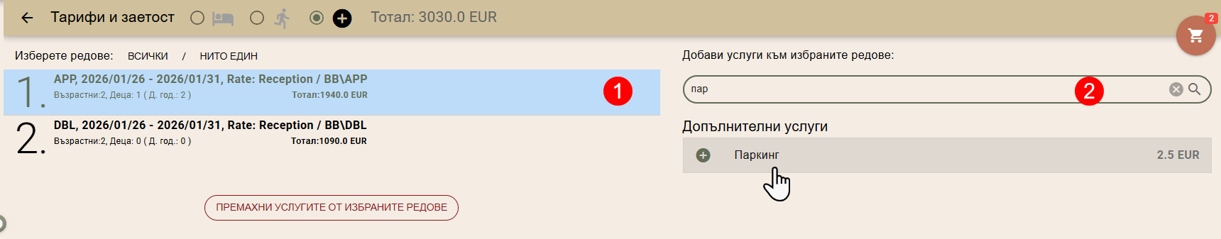 • От списъка вляво маркирайте резервацията (1) или резервациите, към които искате да добавите услуги;