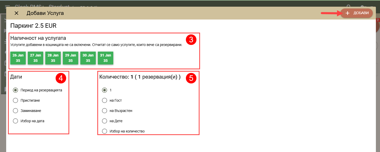 Изберете датите (4), за които да бъде добавена услугата. Налични са следните опции: