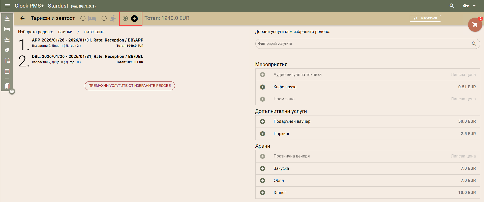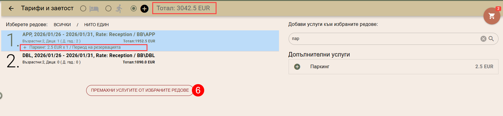 Системата ще ви върне в предходния екран, където ще видите услугите, добавени към резервациите. За всяка резервация ще бъде показана актуализирана цена, както и актуалната обща сума на кошницата. Ако сте допуснали грешка, при начисляване на услугите, маркирайте резервацията и изберете бутон "Премахни услугите от избраните редове", след това добавете коректните услуги.