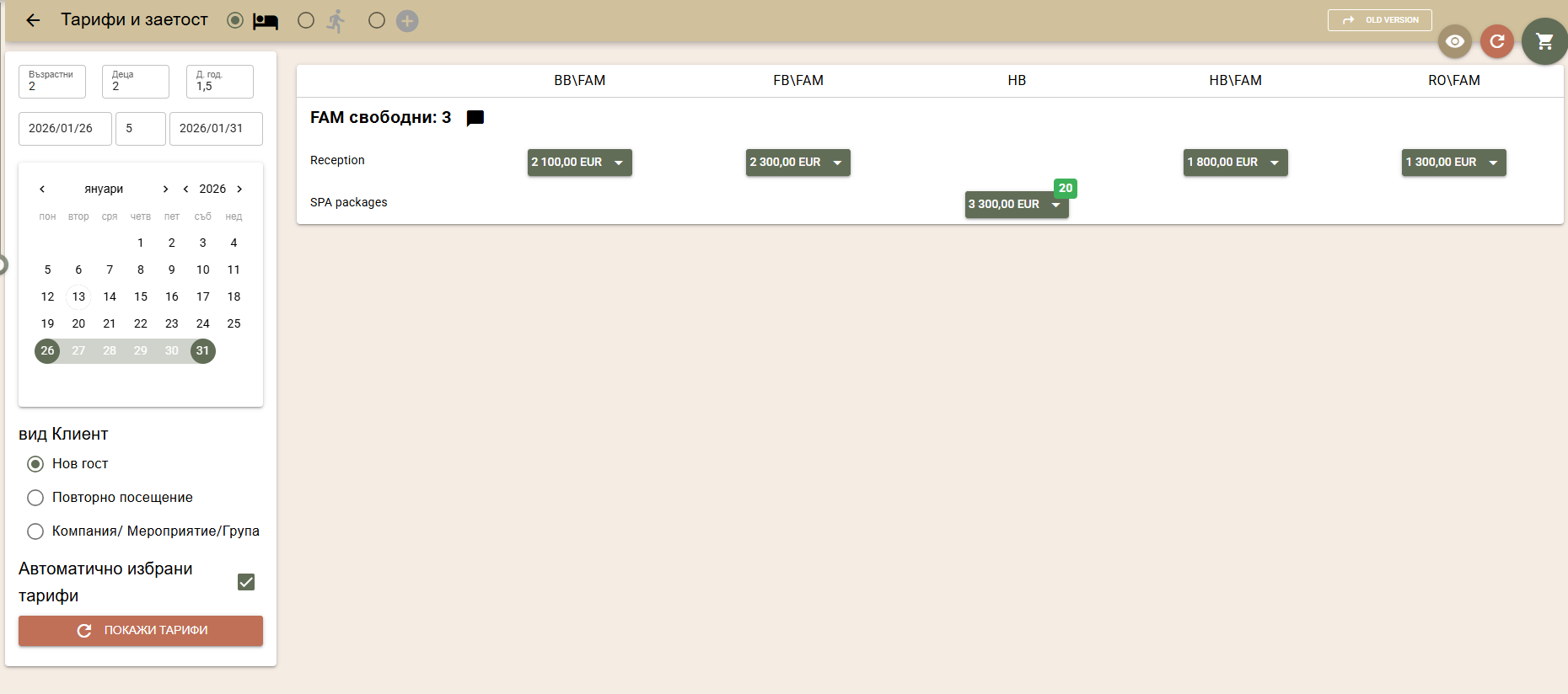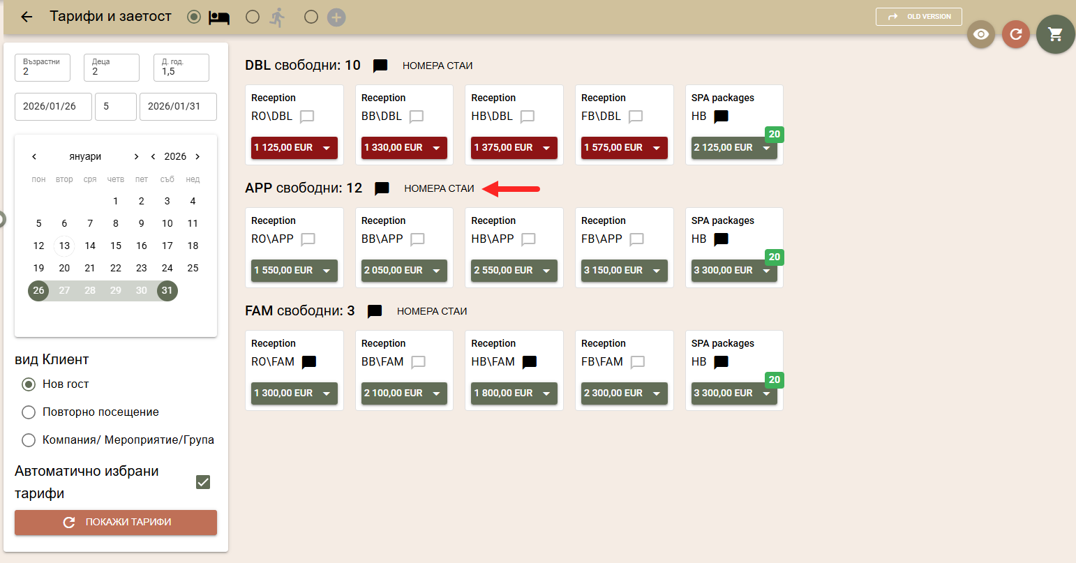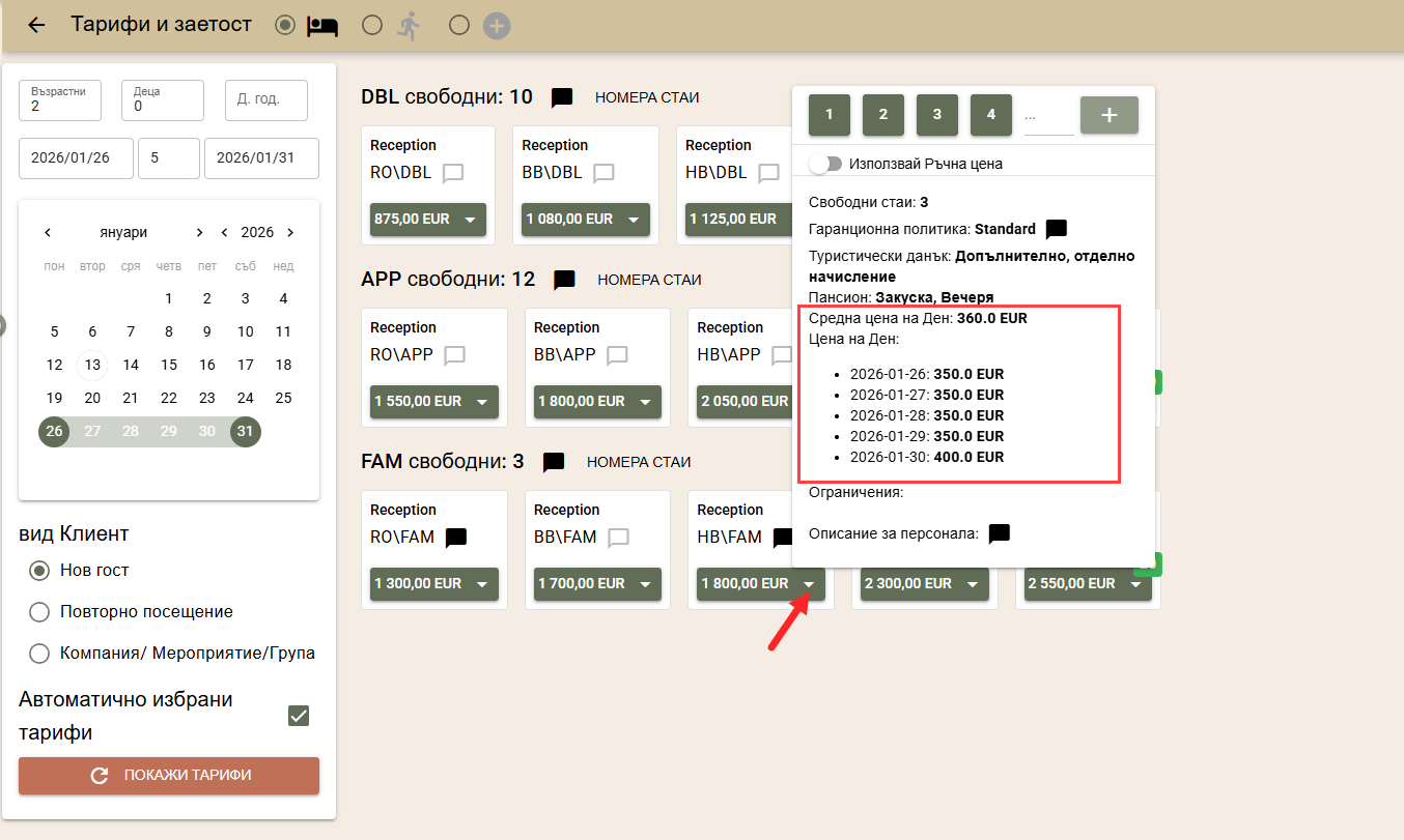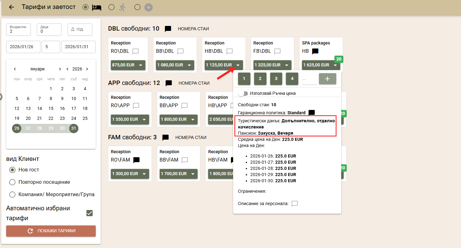 По подразбиране цените на стаите за търсения период се изчисляват по автоматично избрани от системата тарифи, в зависимост от вида на клиента:
