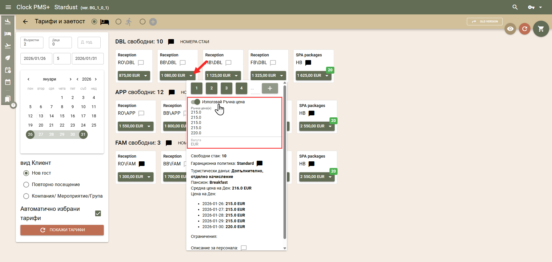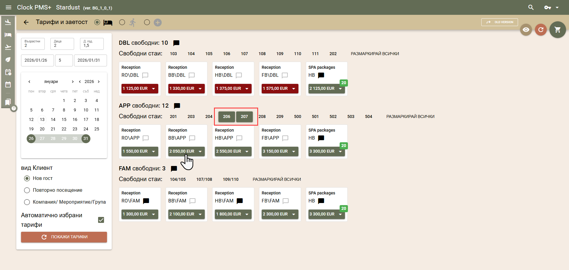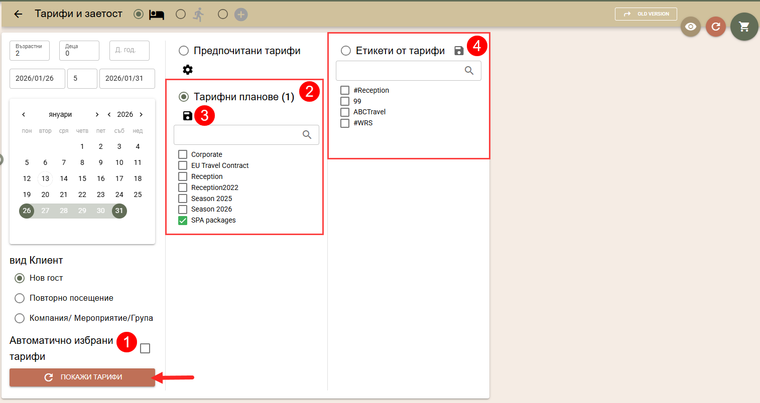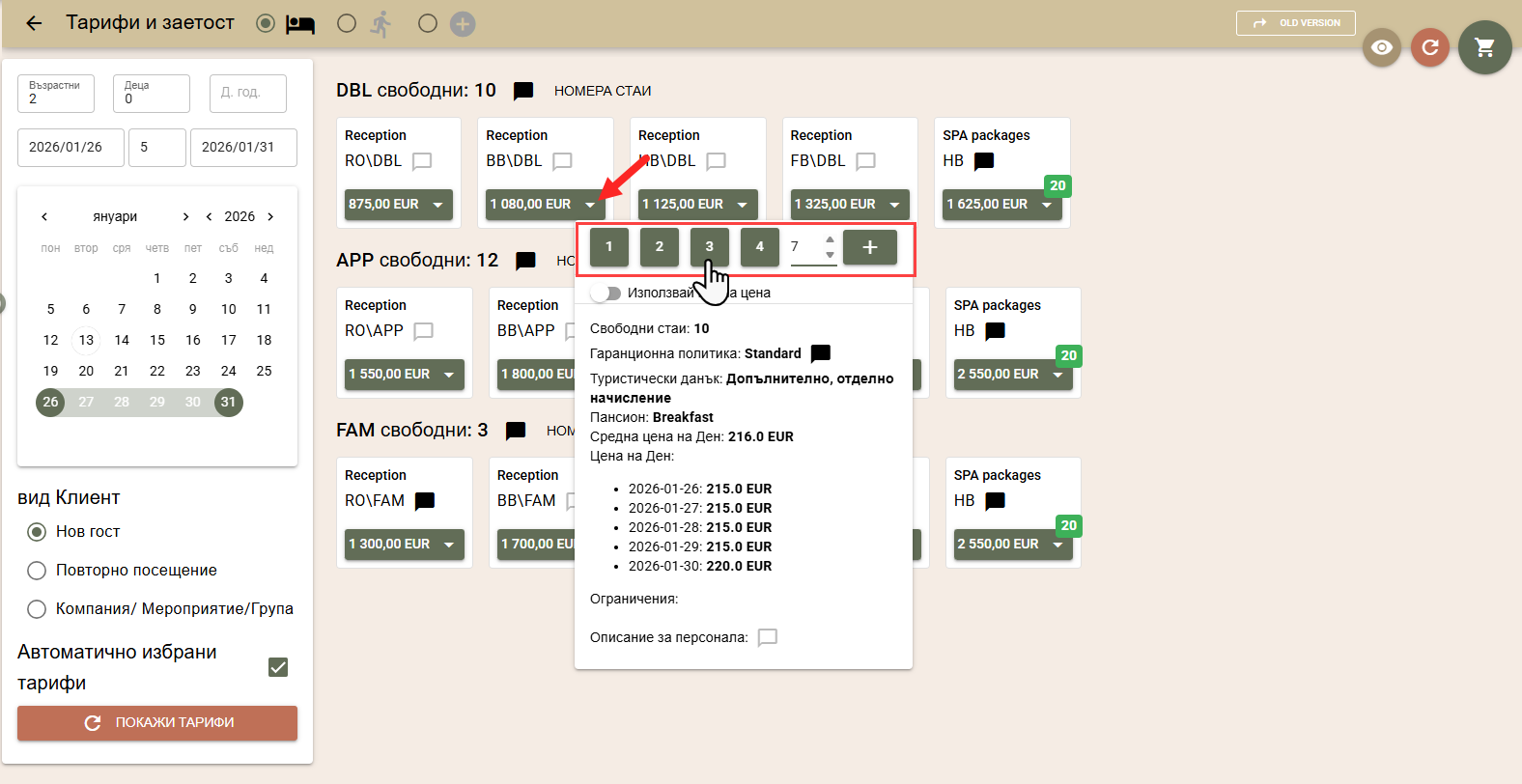 По подразбиране цените на стаите за търсения период се изчисляват по автоматично избрани от системата тарифи, в зависимост от вида на клиента: