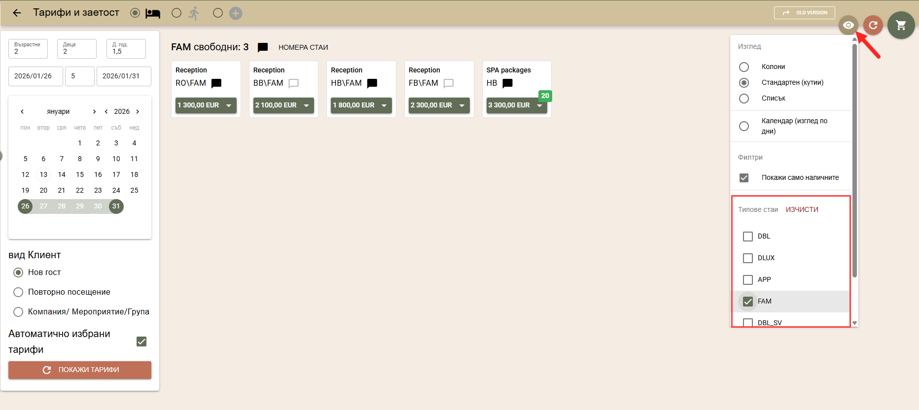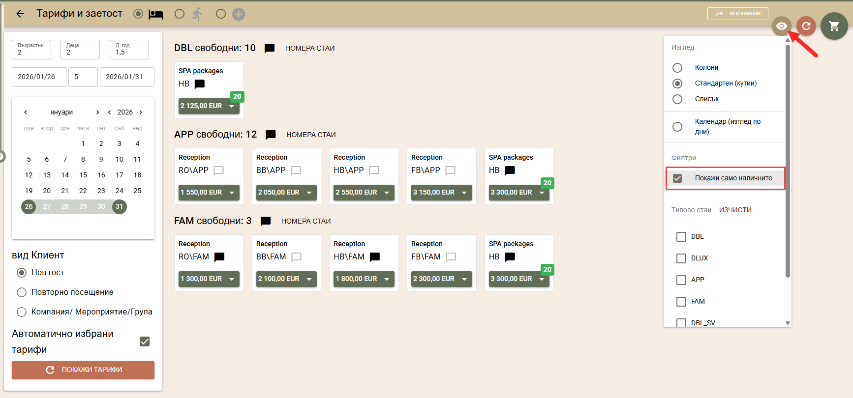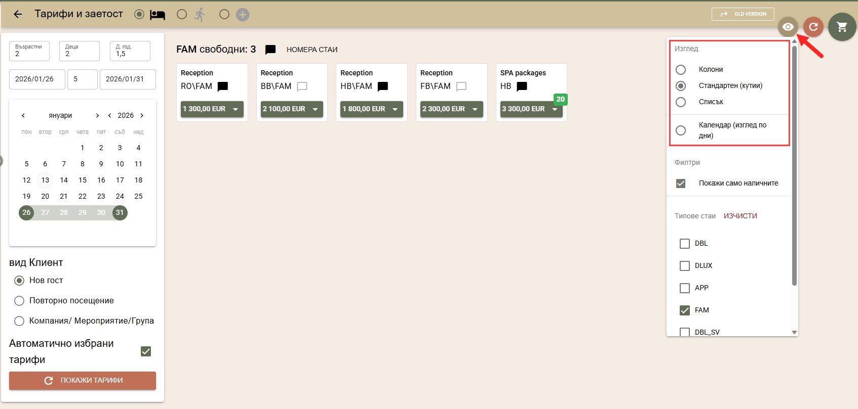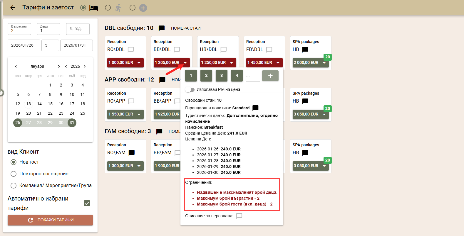 По подразбиране цените на стаите за търсения период се изчисляват по автоматично избрани от системата тарифи, в зависимост от вида на клиента: