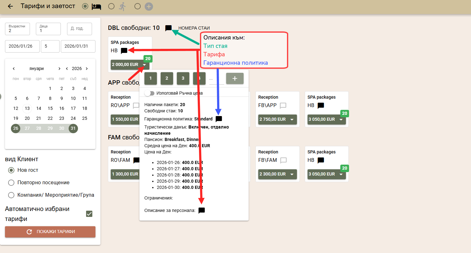 - Описания за персонала за тип стая, тарифа и гаранционна политика;