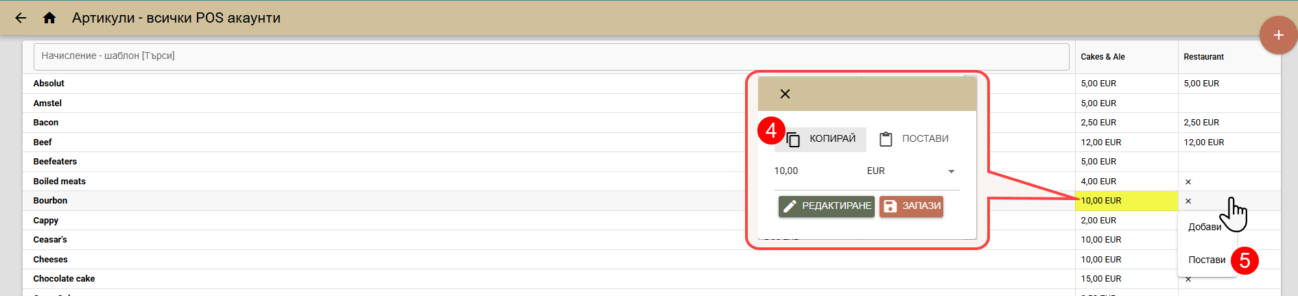 - Копирайте артикул (4) от един ПОС и го поставете(5) в друг (или няколко). При поставяне на артикула ще се отвори пълният редактор, за да прегледате информацията и да приложите корекции, ако е необходимо.