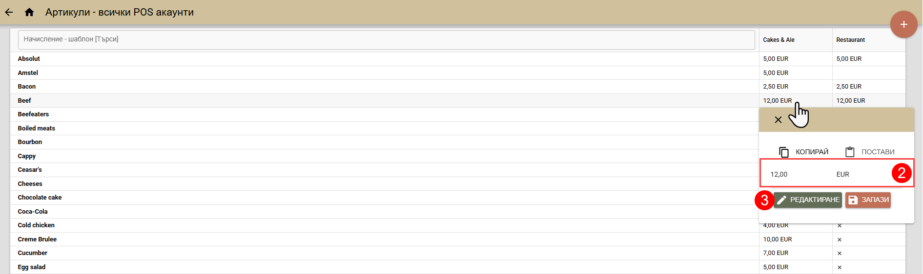 - Кликнете в клетка, за да коригирате цената директно (2) .