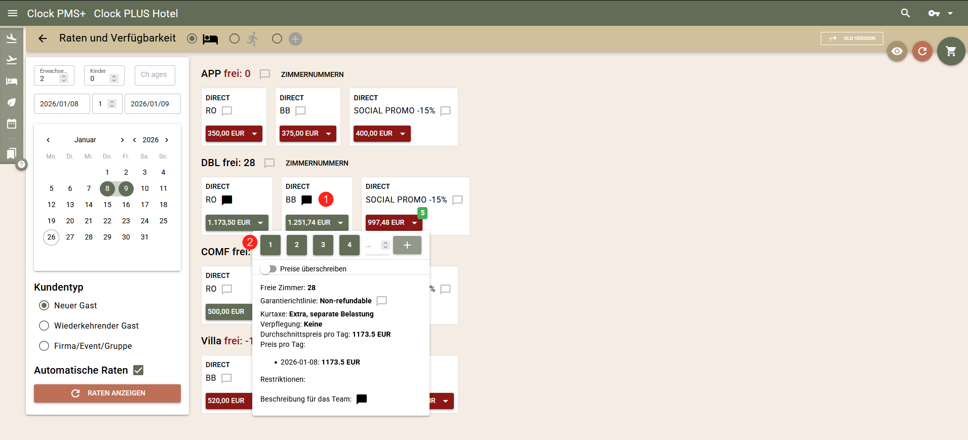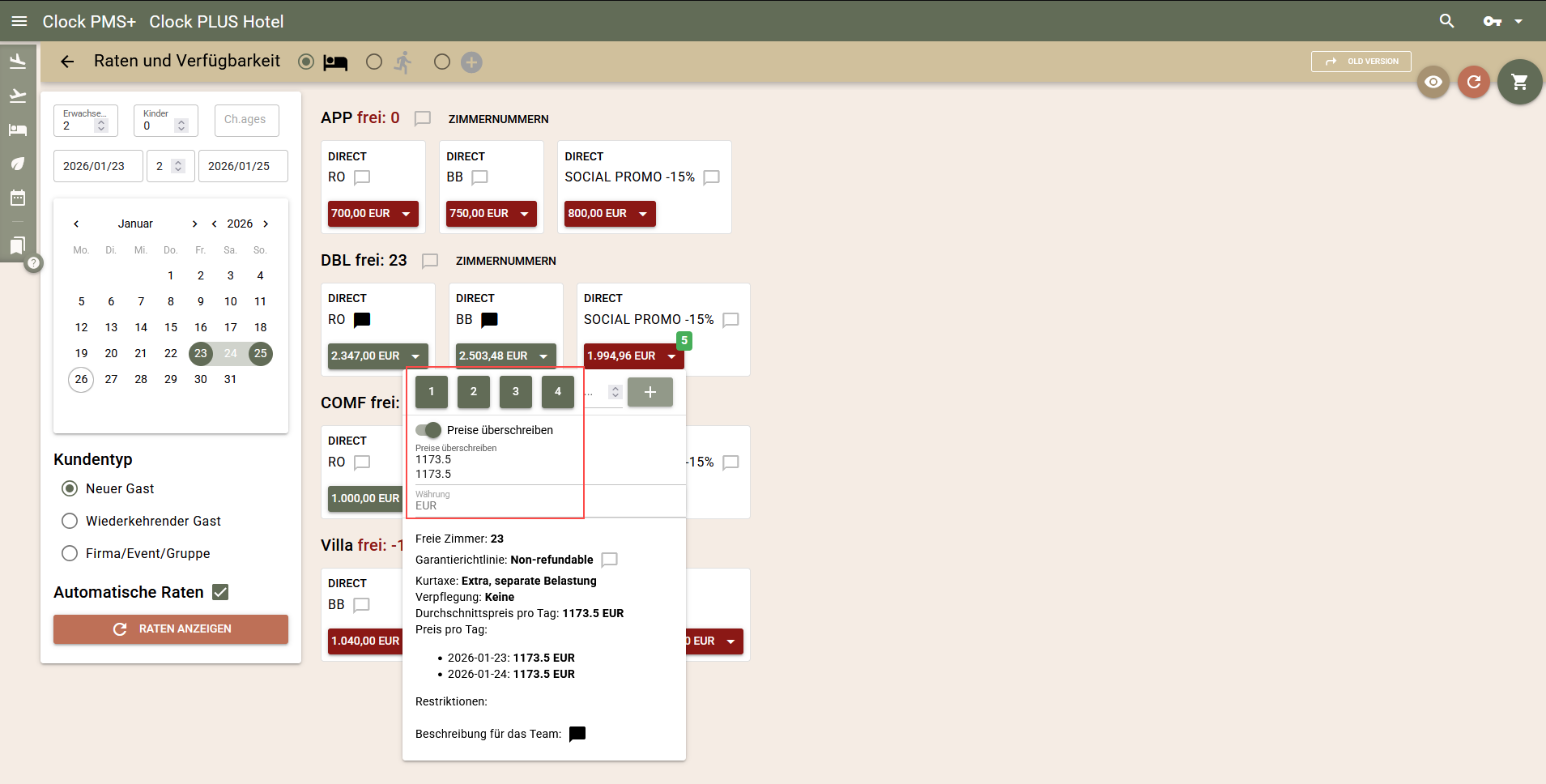 So eingegeben, wird der Preis in das Feld 'Preise überschreiben' der Buchung übertragen und der Gast kann zum angebotenen Preis buchen.