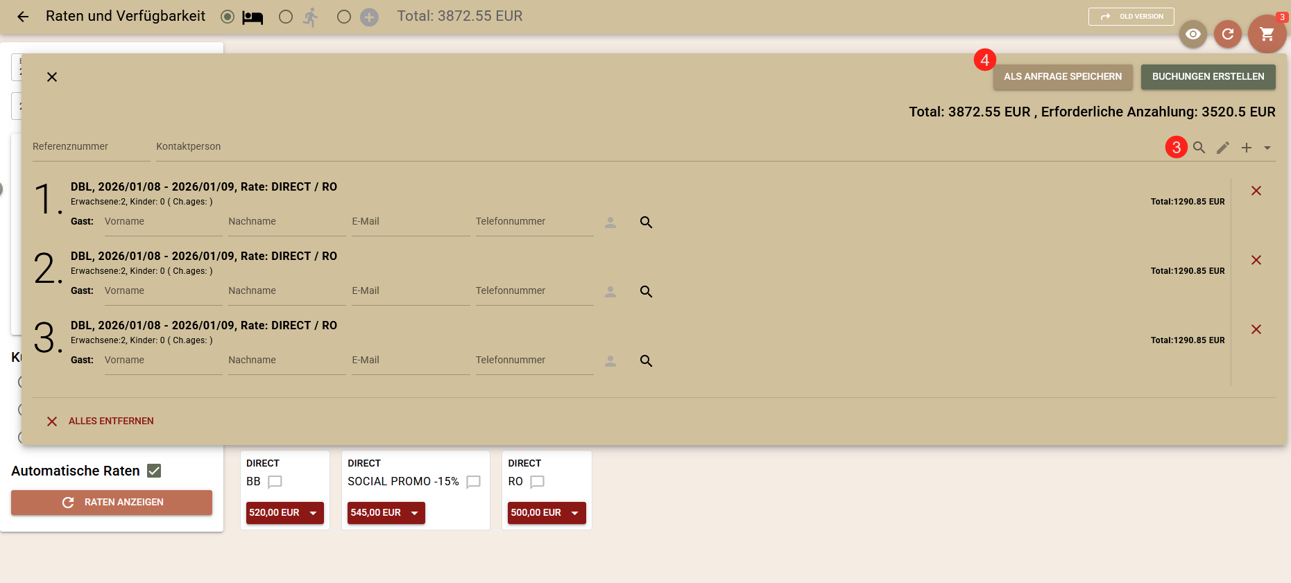Nach dem Erhalt einer E-Mail oder eines Telefonanrufs eines Gastes mit der Bitte um eine Buchung auf der Grundlage der Buchungsanfrage, sind hier die Schritte zur Erstellung der Buchung: