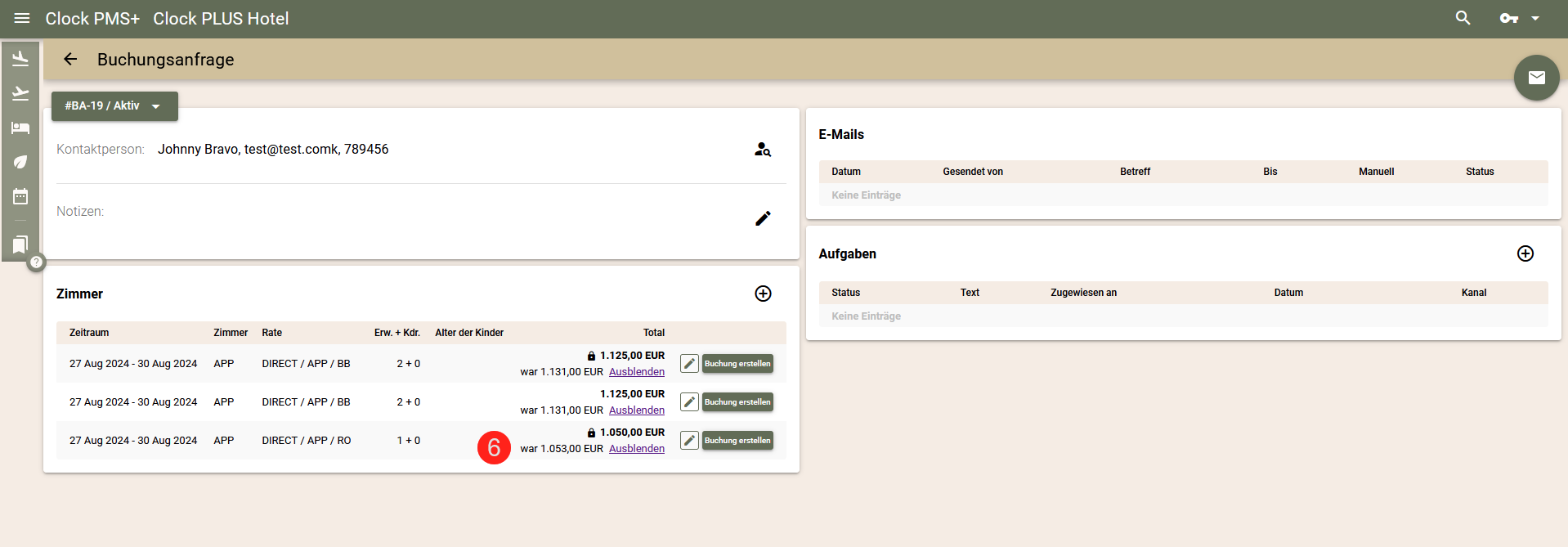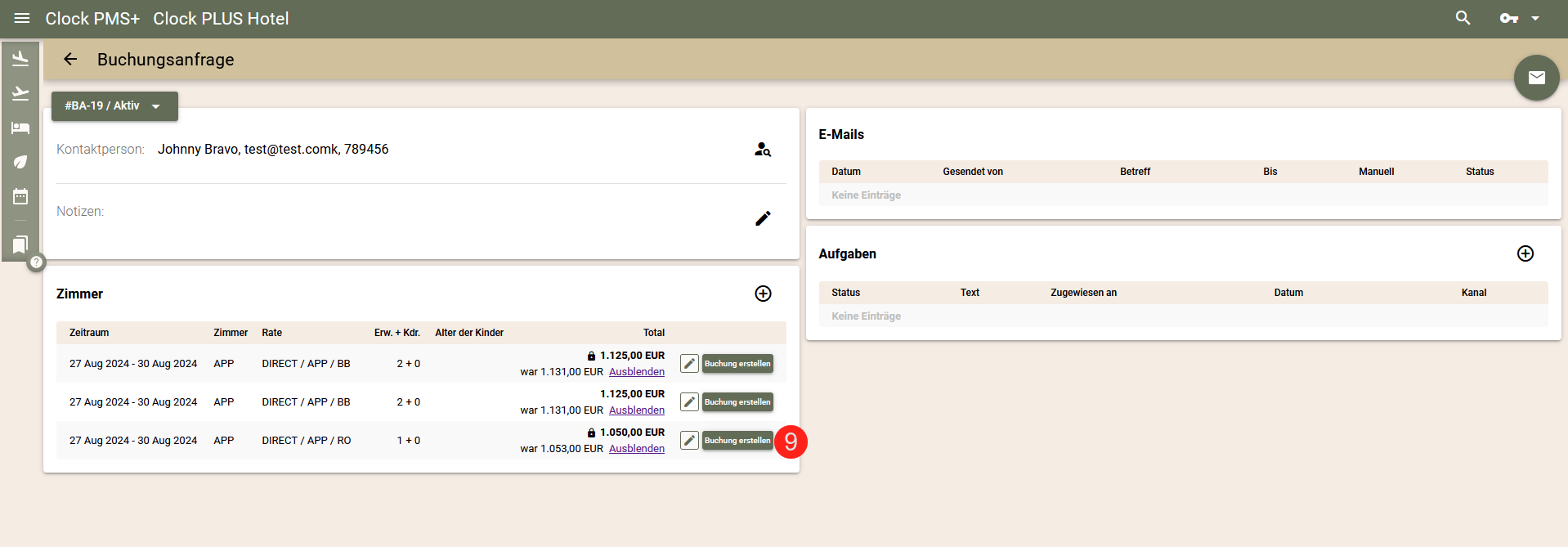 - Klicken Sie auf die Schaltfläche 'Buchung erstellen' (9) neben dem entsprechenden Zimmer;