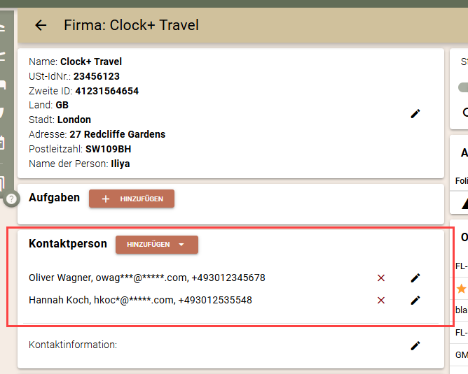Die Funktionalität der Kontaktperson kann auch auf dem Firmenbildschirm verwendet werden. Sie können mehrere Kontaktpersonen zu einer Firma hinzufügen. Abgesehen von den Referenzinformationen auf dem Firmenbildschirm können Sie in den Buchungen ganz einfach Kontaktpersonen auswählen, die mit der gegebenen Firma in Verbindung stehen.