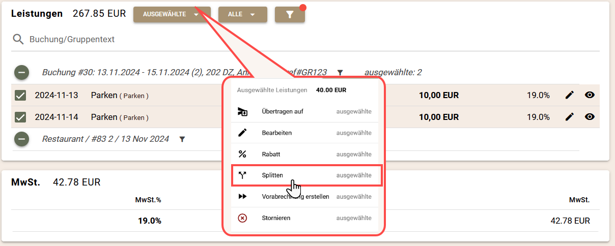 - Wählen Sie die Leistungen aus, die Sie splitten möchten;