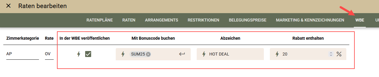 Neben einem Bonuscode können Sie auch ein ‘Angebotslabel’ auf die Rate anwenden. Das Angebotslabel ist neben dem Namen der Rate sichtbar. Sie können Angebotslabel auf alle Raten anwenden, die in der WBE veröffentlicht werden, nicht nur auf die, die hinter einem Bonuscode versteckt sind.