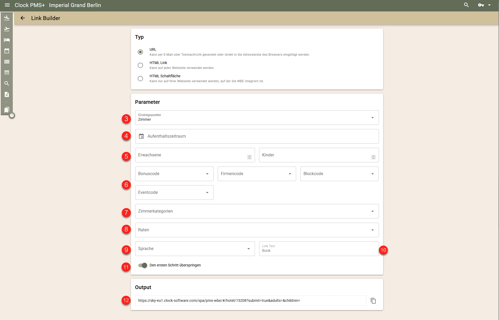- Zimmerkategorien (7) - wählen Sie die Zimmerkategorie/n (falls vorhanden), die in den Link vorgeladen werden.
