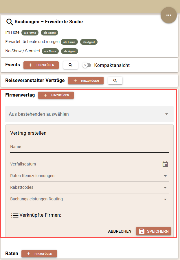 Hinweis: Sie können von hier aus keine Verträge mit Firmen verknüpfen. Sie erstellen nur die Verträge, die Verknüpfung erfolgt wie oben beschrieben..