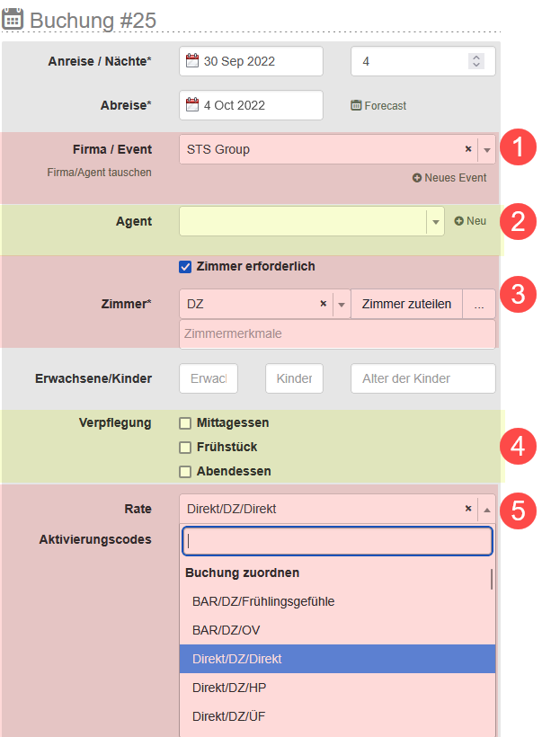 - Buchung zuordnen - enthält die Raten, die dem Zimmerkategorie (3) und den Mahlzeiten (4) der Buchung entsprechen.