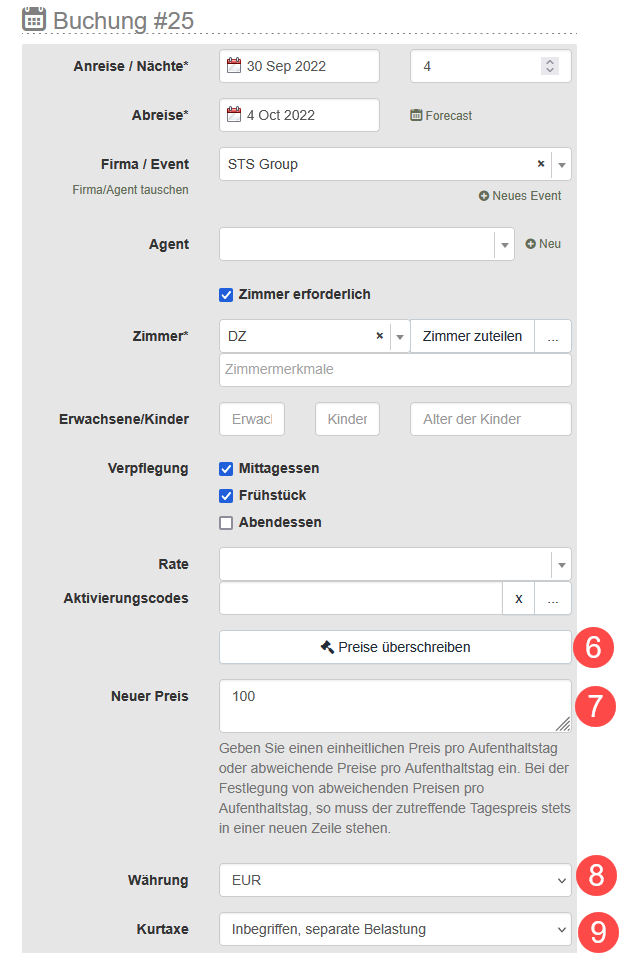 Wenn Sie einen Parameter der Buchung ändern, der für den Preis ausschlaggebend ist, z.B. die Anzahl und das Alter der Gäste, wird der Preis der Buchung neu berechnet. Bei der Änderung des Buchungsaufenthaltes werden die gültigen Preise, die in der Rate festgelegt sind, übernommen.