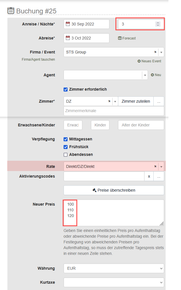 - Die Anzahl der Zeilen mit Preisen muss mit der Anzahl der Nächte der Buchung übereinstimmen, da das System sonst beim Speichern der Buchung Fehler erzeugt.