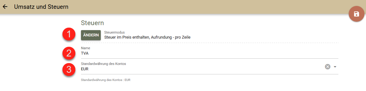 Um die Steuereinstellungen zu konfigurieren, wählen Sie in der Ansicht des POS Verwaltung->Besteuerung.