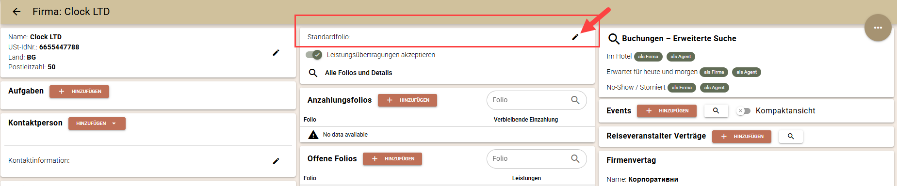 Um dem entgegenzuwirken, können Sie in den Profileinstellungen der Firma ein 'Standard' Folio auswählen, auf das alle diese Leistungen übertragen werden.