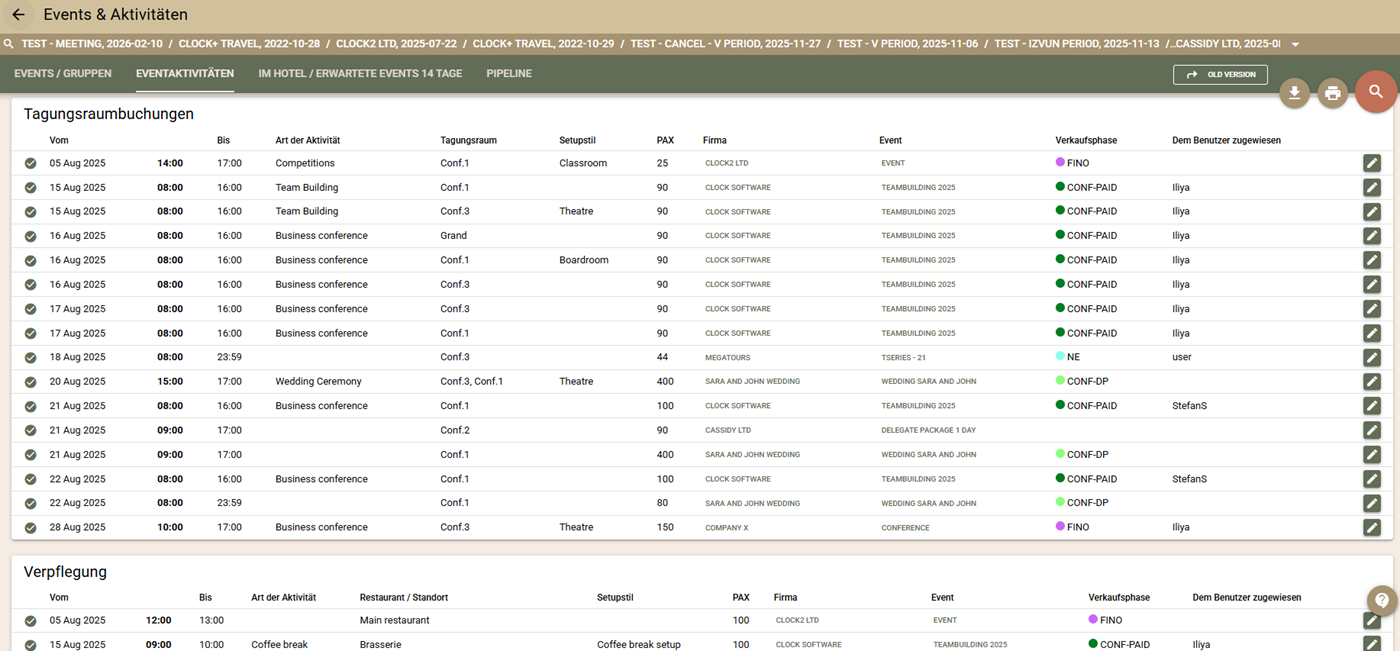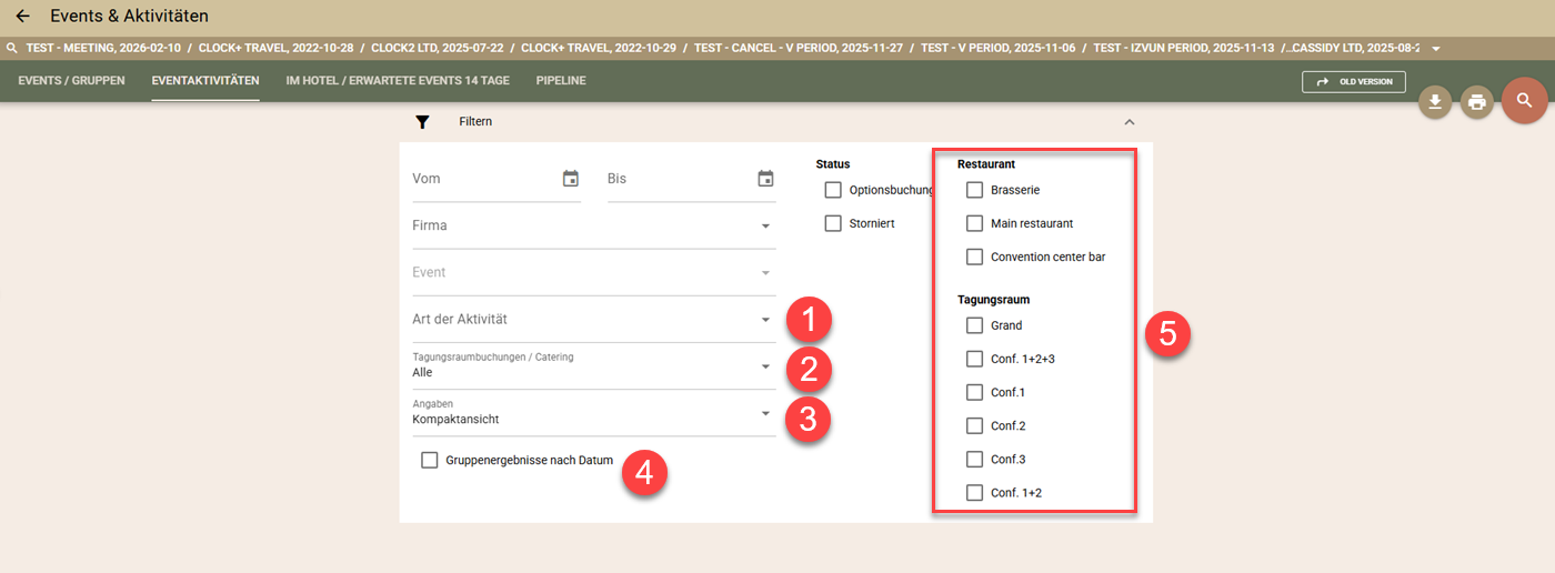 - Buchungen/Catering (2) - suchen Sie nur nach Tagungsraumbuchungen oder Catering-Aktivitäten.