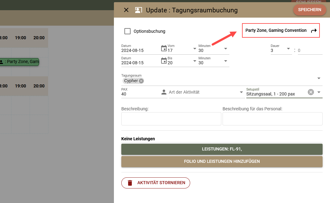 - wenn es sich um eine Aktivität im Tagungsraum handelt, klicken Sie sie an