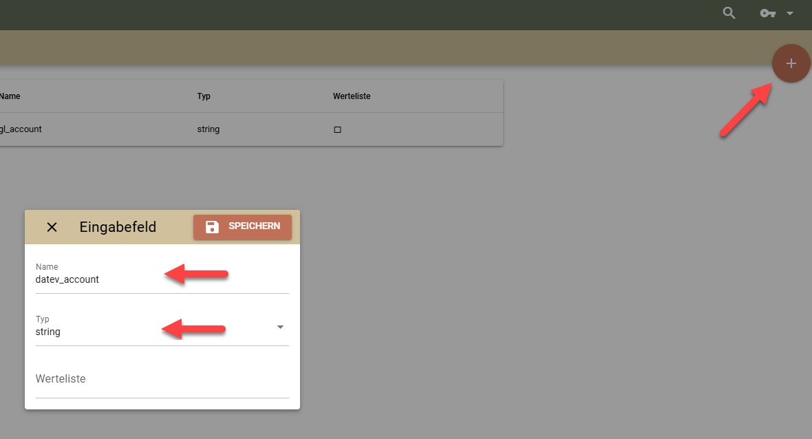 - Navigieren Sie zum Menü Einstellungen -> Alle Einstellungen -> Benutzerdefinierte Eingabefelder für Leistung -> und überprüfen Sie, ob bereits ein Feld mit dem Namen datev_account vorhanden ist. Wenn nicht, erstellen Sie bitte eines mit Name: datev_account und Art: Zeichenfolge