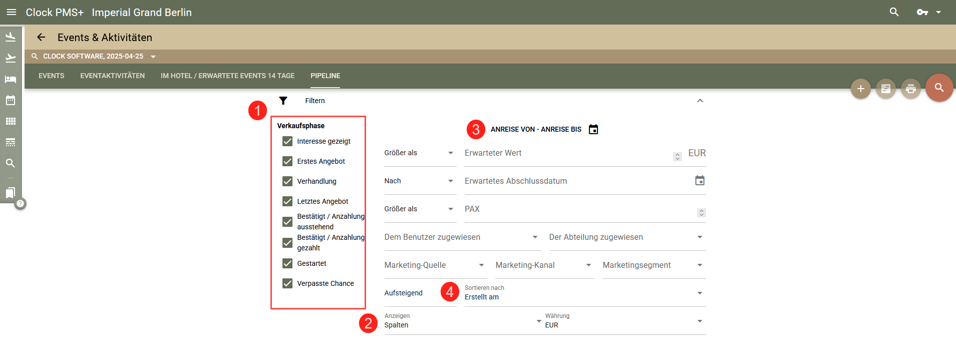 Wichtig: Um die Pipeline nutzen zu können, müssen Sie zunächst Verkaufsphasen erstellen und diese Ihren bestehenden Events zuordnen.