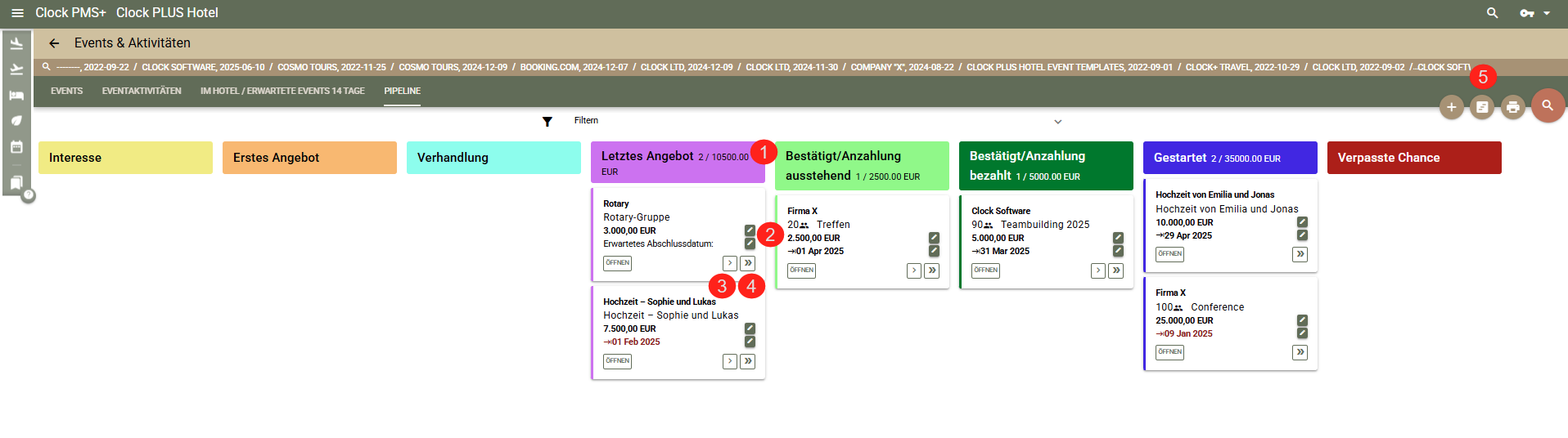 Pipeline ist ein spezieller Bildschirm, der die Verwaltung des Vertriebs durch eine klare Visualisierung der Events entsprechend ihrer Verkaufsphasen verbessert. Sie bietet eine übersichtliche Perspektive, die Ihnen hilft, Events schnell zu bewerten und zu verwalten, während sie Ihren Verkaufsprozess durchlaufen. Sie können darauf über das Navigationsmenü Event -> Pipeline oder als Schnellzugriffsregisterkarte bei der Suche nach Events zugreifen.