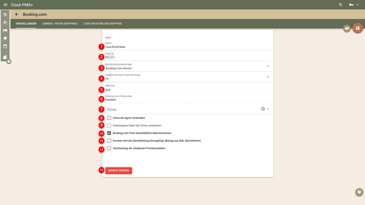 - Neu senden (13) - Ermöglicht die Planung einer manuellen vollständigen Aktualisierung von Verfügbarkeit, Preisen oder Restriktionen. Nur auf Anfrage von Clock oder dem Booking.com-Support verwenden.