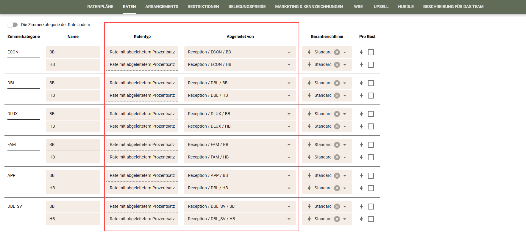 In den Beispielbedingungen haben wir mehrere Optionen für „Rezeption”-Preise, die je nach Zweck mit einem prozentualen Rabatt oder Zuschlag modifiziert werden. Für ihre Konfiguration verwenden wir Raten mit abgeleitetem Prozentsatz.