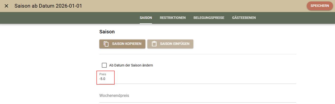 - In der Ansicht „Saison” geben wir für jeden Tarif -5 (5 % Rabatt) ein. Der Einfachheit halber können wir die Option „Saison kopieren” verwenden.