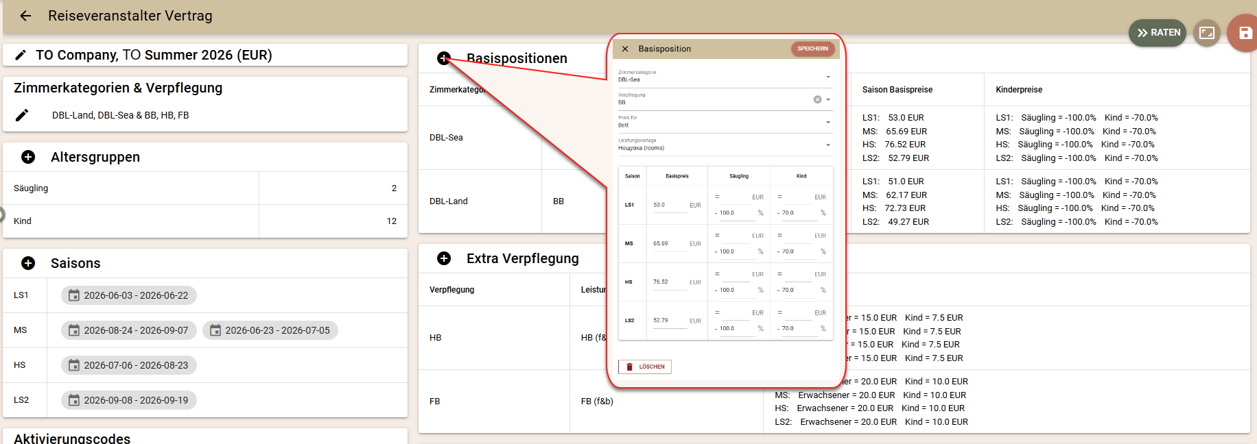 Hinweis: In unserem Vertrag haben wir nur einen prozentualen Rabatt für jede Altersgruppe. In einigen Reiseveranstalter Verträgen können die Rabatte jedoch je nach Zusammensetzung der Gäste variieren. In solchen Fällen ist es richtig, den Preis oder Rabatt einzugeben, der für die jeweilige Altersgruppe am häufigsten gilt.