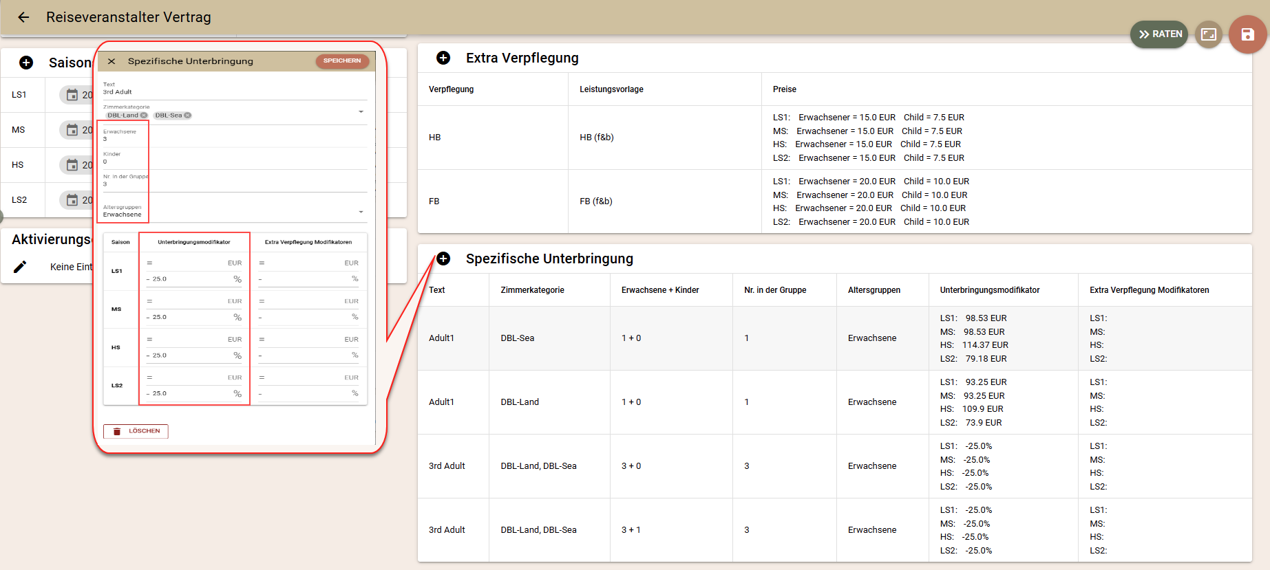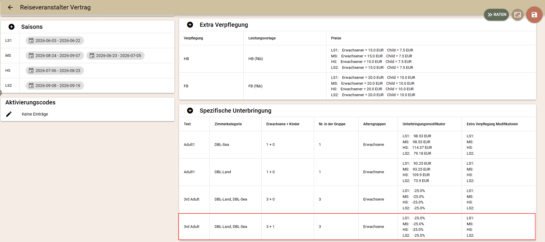 Damit sind alle Grundpreise und spezifischen Ausnahmen zum Reiseveranstalter Vertrag konfiguriert. Fahren Sie mit dem weiter Artikel fort, um zu erfahren, wie ein Rabatt angewendet wird.